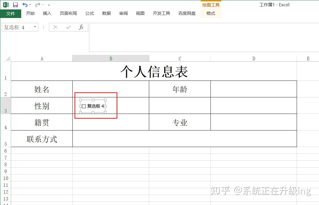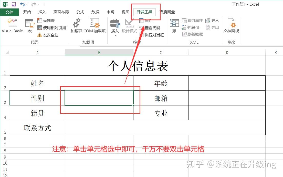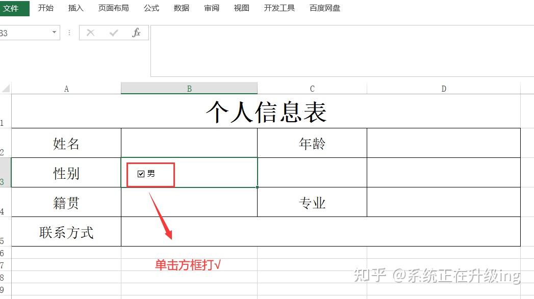 图42、在Excel表格(图5)性别后单元格创建打√方框,单击需要创建打√方框单元格(注意:不要双击单元格,否则“开发工具”栏会变灰无法使用),点击“开发工具”。