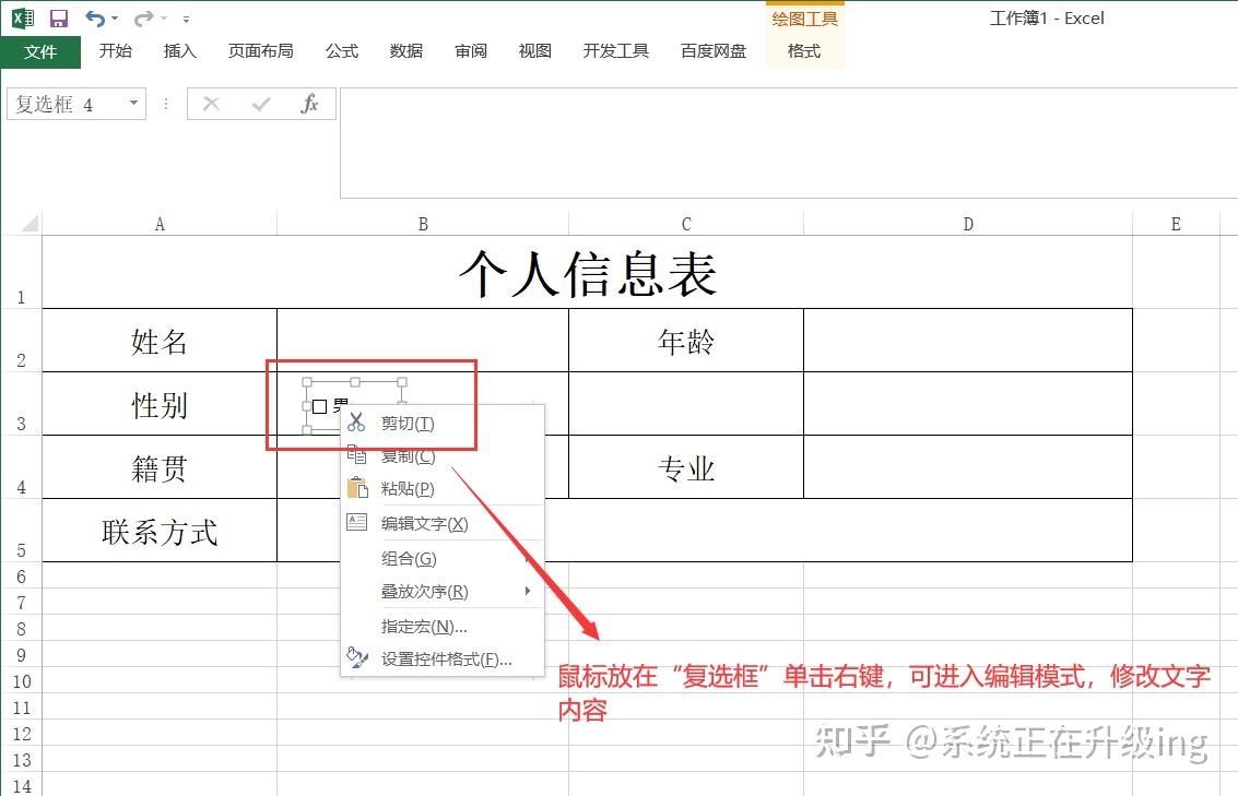 复制方法:鼠标放在“复选框”单击右键,进入编辑模式,按住Ctrl键不放拖动边线框,到指定位置后先松开鼠标,再松开Ctrl键,然后再按之前方法修改方框后文字内容即可,这里我们将复制的“复选框”文字修改为“女”,就全部设置完成了。