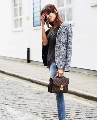 国外时尚博主街拍造型演绎,很精辟的休闲混搭,灰色斜纹软呢外套搭配牛仔裤红色休闲平底鞋,手提一款Monogram metis lv邮差包,充满率性感与魅力