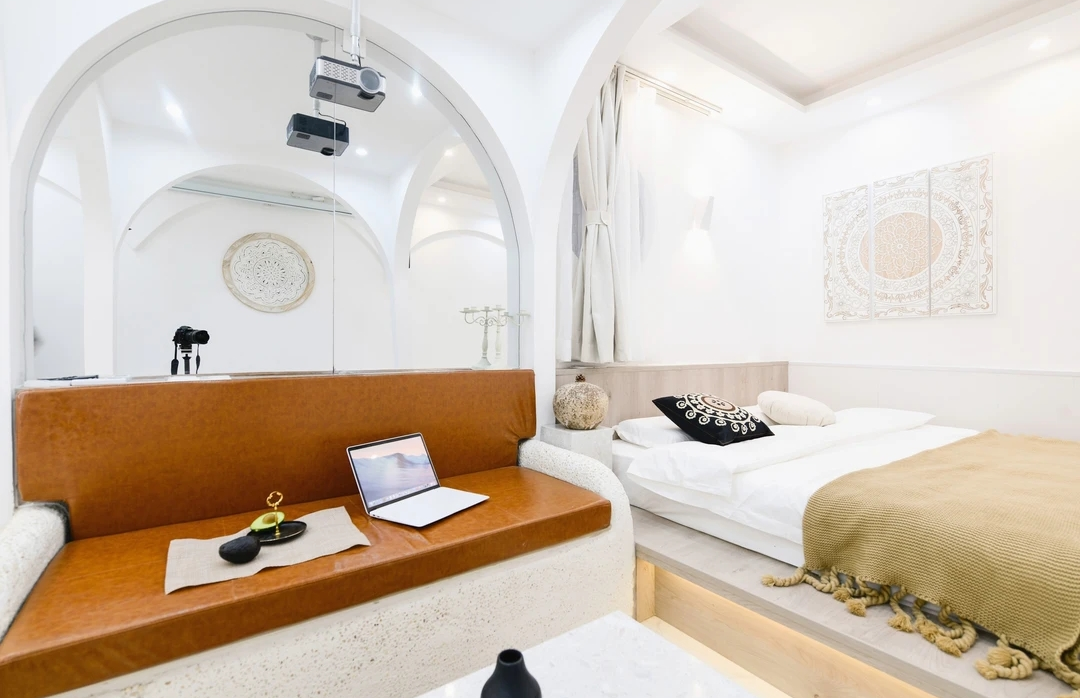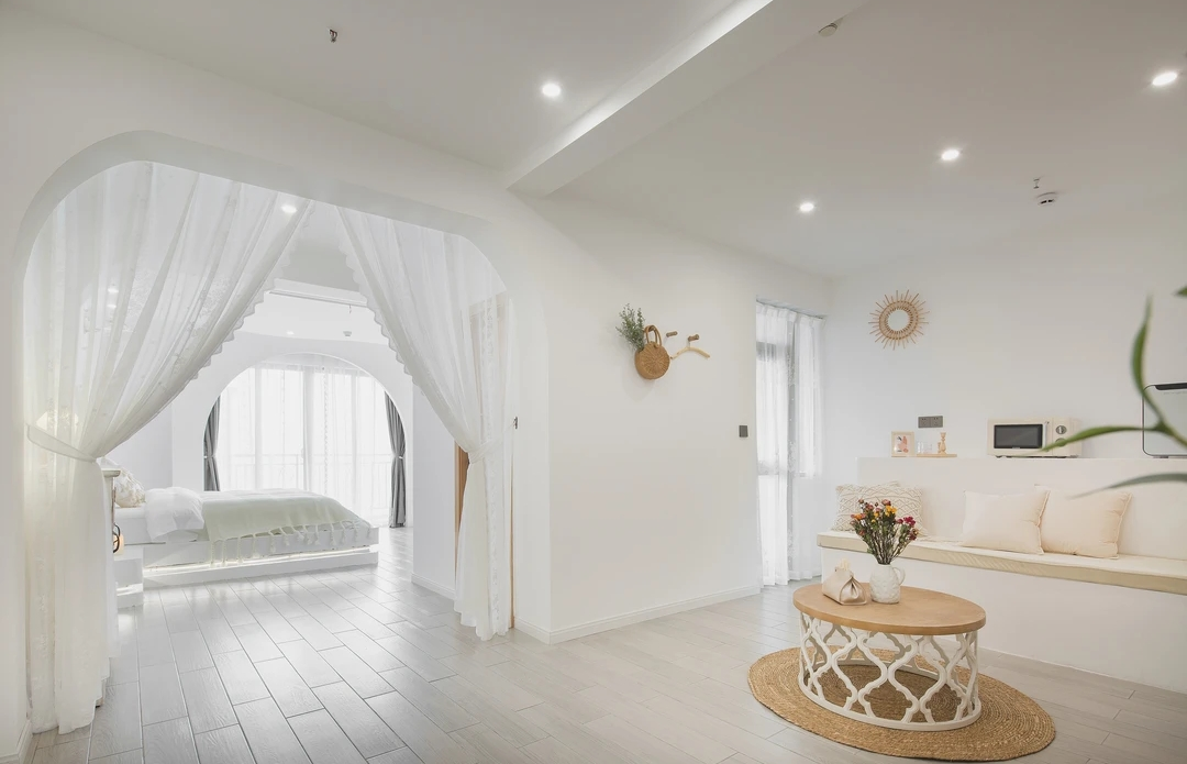 装修于2019年,房间有很多风格,如简约风格,法式风格,波西米亚风格等,各有特色。一线江景房,有大落地窗,部分房间还配有浴缸、投影仪和洗衣机。