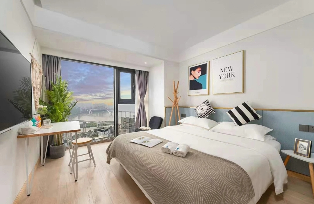 装修于2019年,房间有日式风、简约风和北欧风,因为楼层很高的缘故,视野非常开阔,能俯瞰整个城市的夜景,再加上超大的落地窗,景色很漂亮。配有浴缸和投影仪。