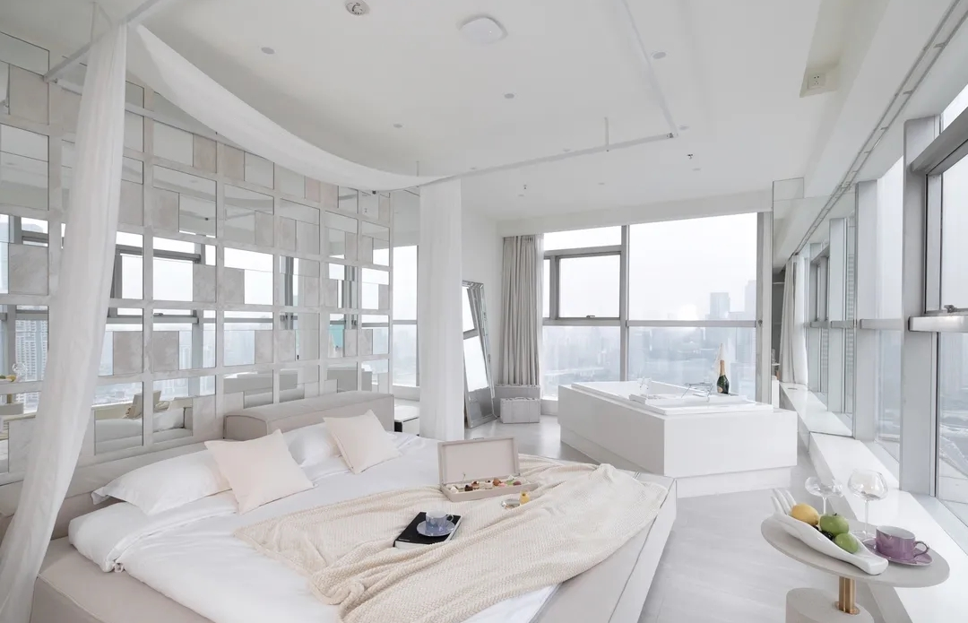 61层的高度,配上超大的落地窗+浴缸,晚上可以边泡澡边欣赏整个城市的夜景。