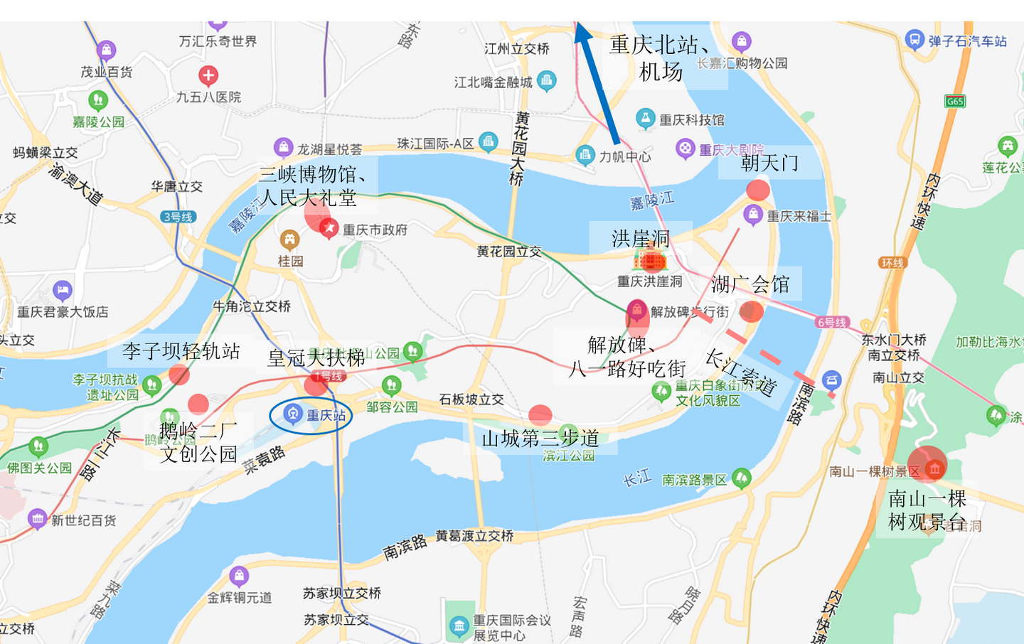 如果预算充足,想玩的舒服些,推荐住在解放碑附近,这里是重庆最繁华的商圈,有轻轨,离各景点也很近,不管是逛景点还是吃饭都很方便;如果预算有限的话,推荐住在两路口或牛角沱,这里都是轻轨的换乘站,出行也很方便。具体可以看这个图:
