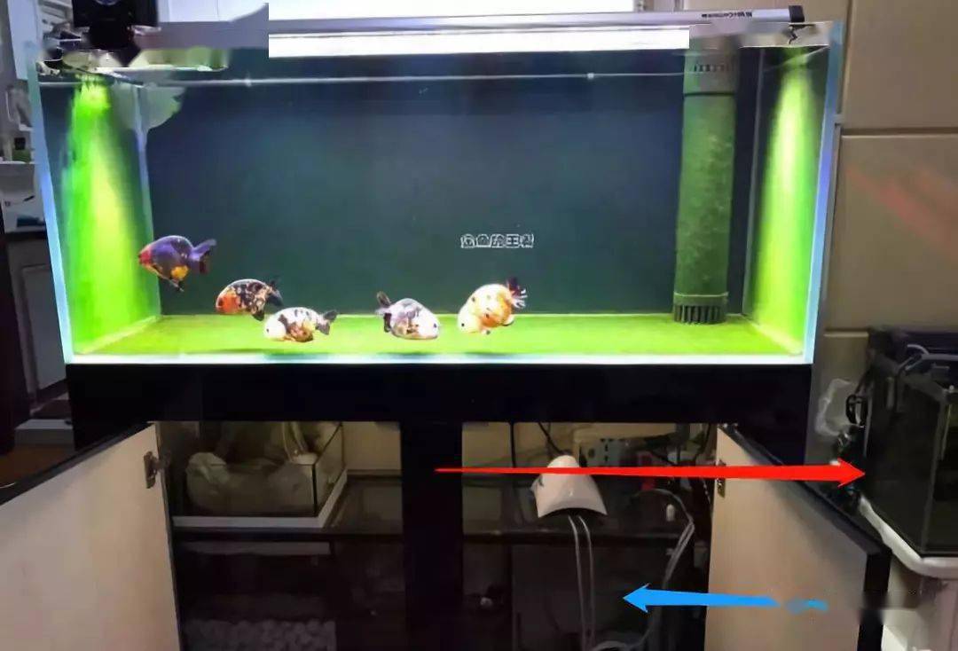 在最常见的溢流过滤上面,增加一套虹吸排水(红色)和滴流进水(蓝色)系统。