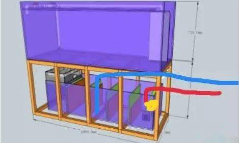 如上图用一根2分管放入过滤槽虹吸排水,取代传统的开孔排水。进水就是自来水经过净水器处理流入过滤缸,进水管在一定水位安装补水球阀便于控制。图上蓝色为(虹吸排水管), 红色为(滴流管), 黄色为(补水球阀)。