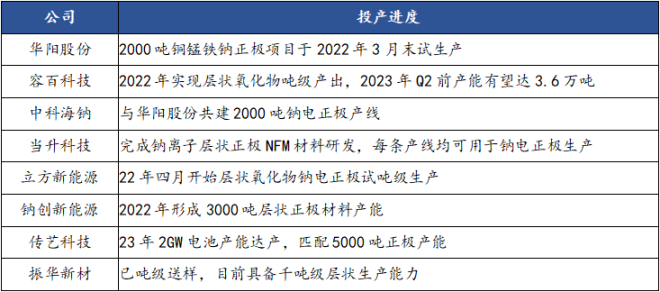 目前采用层状氧化物路线的钠离子公司包括中科海钠、立方新能源、钠创新能源等,相关公司产业化进度汇总如下: