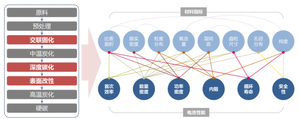 由于钠离子半径大于锂离子,因此无法在石墨层间嵌入/脱嵌,因此其负极使用无序度大的无定型碳,可分为硬碳和软碳两类(在2800℃以上可以石墨化的碳材料称为软碳,反之称为硬碳)。由于软碳的克容量低于硬碳,目前行业内钠离子电池负极主要使用硬碳。2.2.1 硬碳硬碳往往具有较大的层间距(通常大于 0.37nm),较多的纳米孔洞以及较多的缺陷位点,因而可以储存较多的钠离子,具有较高的比容量(320-350mAh/g)。但劣势在于:前驱体一般为生物质或其衍生物,炭化后产碳率偏低,经济性略差。从工艺上看,硬碳合成工艺路线较长,构效关系复杂,流程分为预处理、交联固化、中温碳化、深度纯化、表面改性、高温碳化六步,其中关键难点在于交联固化+中温碳化、深度纯化(脱胶、脱脂)、及表面改性(包覆、掺杂),具备较高的Know-How壁垒。硬碳最终的空心率、孔径一致性决定硬碳的容量,其很大比例取决于前驱体本身性质,因此需要严格的原料管控。硬碳前驱体一般采用生物质基(植物基),但也可以采用沥青、煤炭、酚醛树脂作为前驱体,需要进行交联固化,但其容量较差。硬碳目前产业化瓶颈在于无法找到廉价、适合大规模量产的前驱体原材料,国外高端产品价格约20万元/吨,国产产品价格在8万元/吨左右。公开信息显示,目前可乐丽、贝特瑞、佰思格可分别实现320mAh/g、350mAh/g、350mAh/g的克容量。