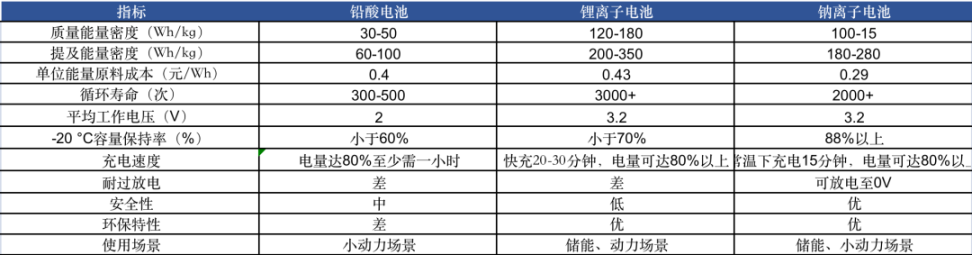 成本对比:成熟后的钠电成本将显著低于锂电和铅酸