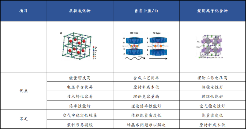 普鲁士蓝 / 白的优点是成本低、合成简单、可设计性强、理论克容量和倍率性能高,但缺点在于除水困难、循环寿命低、实际倍率性能差、体积能量密度低、电压极化大、有热失控风险。