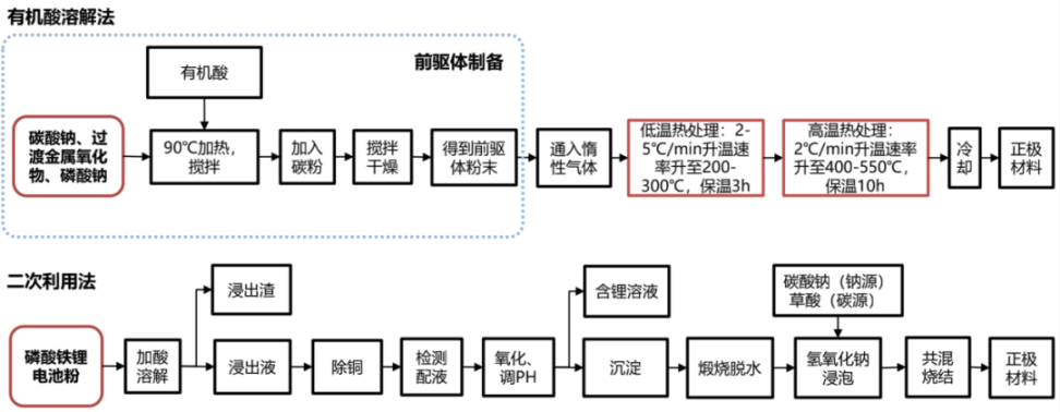聚阴离子化合物合成方法包括有机酸溶解法、二次利用法等,同时均需要使用碳包覆等改性手段提升导电性。目前工艺以有机酸法为主流,有机酸溶解法得到的混合溶液离子分布均匀,前驱体颗粒较小,干燥后的前驱体颗粒较小,无需进行破碎处理,可直接高温煅烧制得相应的电极材料,热处理环节包括两步,对不同环节温度的精准把控是制备工艺的关键,直接影响正极材料成品的性能。