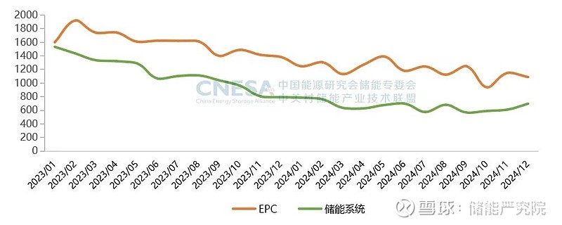 图5:2h储能系统和EPC中标均价变化趋势(2023年1月-2024年12月),单位:元/kWh