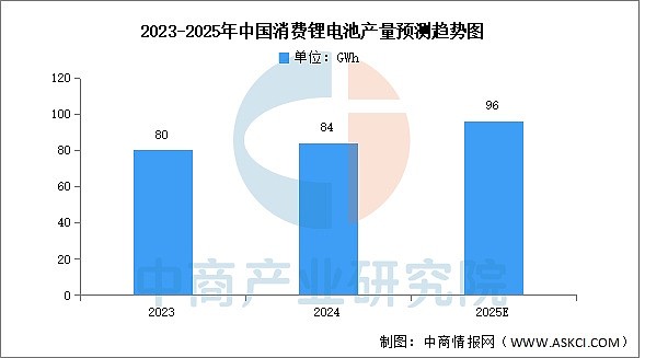 中商产业研究院发布的《2025-2030年中国消费型锂电池行业市场前景预测及未来发展趋势报告》显示,随着消费电子的市场回暖,2024年中国消费锂电池出货量有所增长,达84GWh,同比增长5%。中商产业研究院分析师预测,2025年中国消费锂电池出货量将达96GWh。