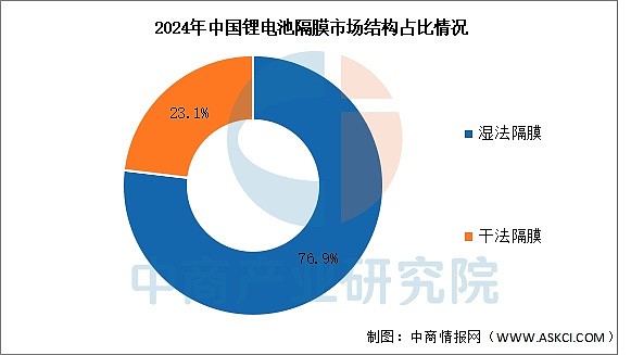 目前锂电池隔膜市场中,湿法隔膜占主导地位。2024年,湿法隔膜出货量在整个隔膜出货量的占比再次提升至76.9%,较2023年的73.1%上升了3.8个百分点。干法隔膜的出货量占比下滑至23.1%。