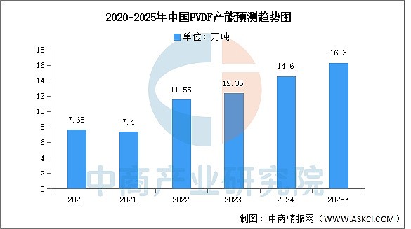 近年来,中国PVDF产能逐步释放,供给扩张迅速。中商产业研究院发布的《2025-2030年中国PVDF涂覆隔膜行业市场前景预测与发展趋势研究报告》显示,2024年产能达14.6万吨,占全球总产能的40%以上。中商产业研究院分析师预测,2025年产能将达16.3万吨。