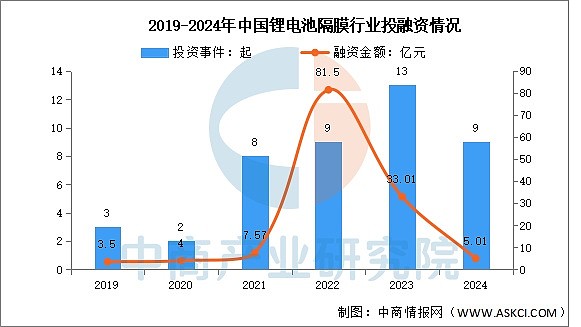 IT桔子数据显示,2024年中国锂电池隔膜已披露投资事件达9起,已披露融资金额达5.01亿元。2025年1-5月,中国锂电池隔膜已披露投资事件达5起,已披露融资金额达4.7亿元。虽然当前锂电池隔膜投融资市场可能呈现出一定的平稳态势,但未来仍具有广阔的发展前景。