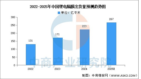 近年来,中国隔膜企业全球供应能力不断提高,锂电池隔膜出货量大幅增长。中商产业研究院发布的《2025-2030年中国锂电池隔膜行业市场深度分析及发展趋势预测报告》数据显示,2024年中国锂电隔膜出货量223亿平米,同比增长30%,其中湿法隔膜出货173亿平米,干法隔膜出货50亿平米。中商产业研究院分析师预测,2025年锂电隔膜出货量将达267亿平米。