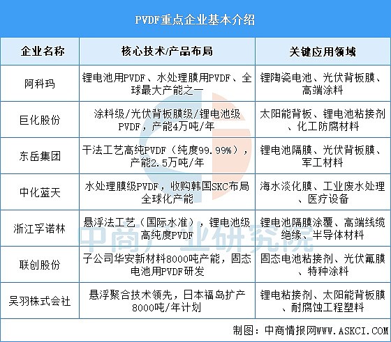 PVDF领域呈现 “高端化+场景定制”双轨竞争 态势,头部企业通过悬浮法工艺升级(如纯度99.99%+)主导锂电池、光伏等新能源市场,同时依托垂直整合产业链(R142b-VDF-PVDF)强化成本优势。国际巨头仍把控高端技术标准,而本土企业加速产能扩张与海外布局,未来竞争焦点将集中在固态电池适配性、半导体级纯度突破及绿色生产工艺迭代。