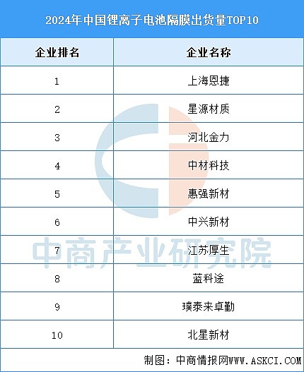 2024年,上海恩捷仍然以接近70亿平米的出货量排名行业第一,但是其市场份额相对2023年有所下降。星源材质以40亿平米的出货量排名行业第二。2024年出货量前十企业中还包括河北金力、中材科技、惠强新材、中兴新材、江苏厚生、蓝科途、璞泰来卓勤和北星新材。