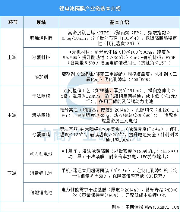 锂电池隔膜产业链上游为原材料,包括聚乙烯、聚丙烯、涂覆材料、添加剂等;中游为锂电池隔膜,可分为干法隔膜和湿法隔膜;下游应用于锂电池,包括动力锂电池、消费锂电池、储能锂电池。