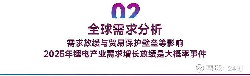 综上所述,由于特朗普上台对华加征关税,欧洲反补贴调查,贸易保护主义抬头影响全球电动化进程叠加国内目前新能源汽车内销渗透率已经超过50%,2025年动力电池主导的锂电产业需求增长趋势放缓是大概率事件。