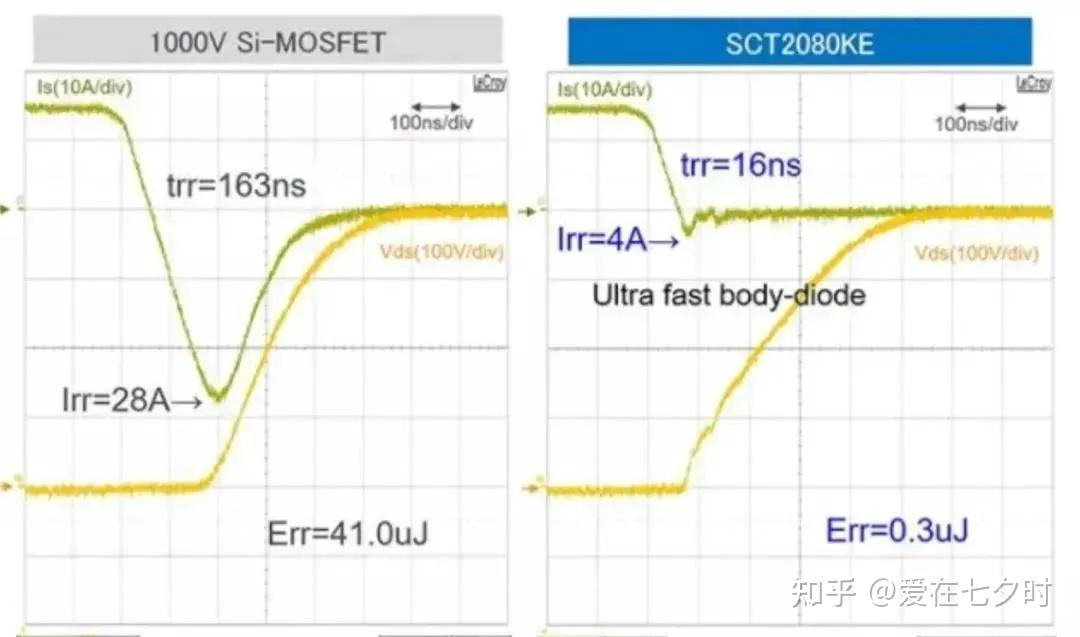 SiC MOSFET 与其硅对应物一样,具有内部体二极管。体二极管提供的主要限制之一是不希望的反向恢复行为,当二极管关断同时承载正正向电流时会发生这种情况。因此,反向恢复时间 (trr) 成为定义 MOSFET 特性的重要指标。图 2 显示了 1000V 基于 Si 的 MOSFET 和基于 SiC 的 MOSFET 的 trr 之间的比较。可以看出,SiC MOSFET的体二极管非常快:trr和Irr的值小到可以忽略不计,能量损失Err大大降低。