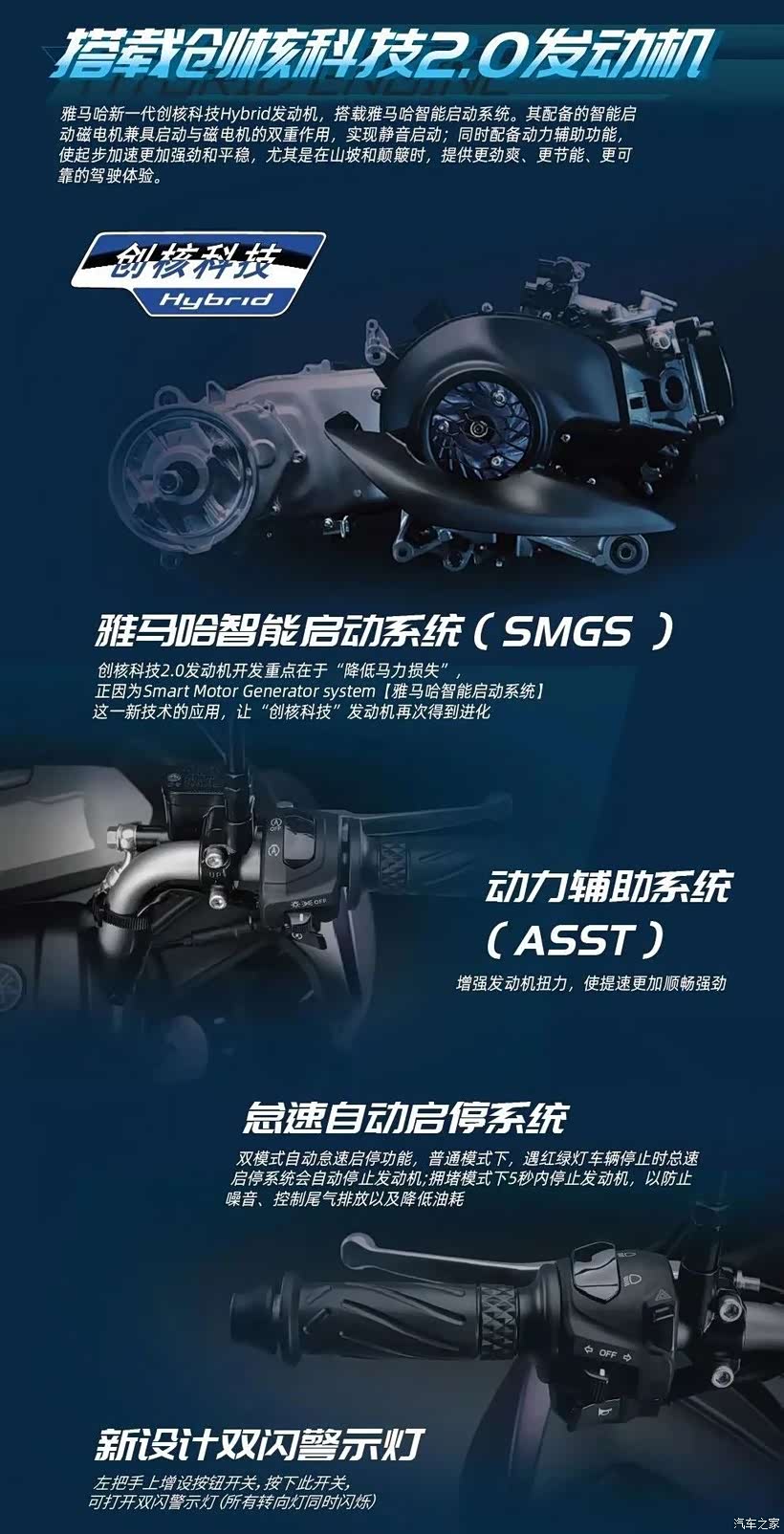 但是这一次在引擎上带来了一些升级,兴鹰125搭载了新款创核科技2.0发动机,在原来的基础上增加了SMGS智能启动功能,针对发动机扭力提升加入了ASST动力辅助系统,同时还有自动启停功能。不过动力参数上与巡鹰125基本一致,最大功率6.1kW/6,500rpm,最大扭矩9.7Nm/5,000rpm。