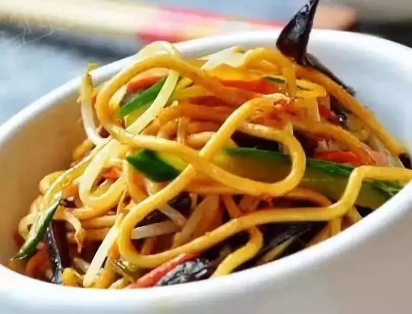 原料:蒸面500g、黄瓜100g、胡萝卜50g、黑木耳50g、绿豆芽100g