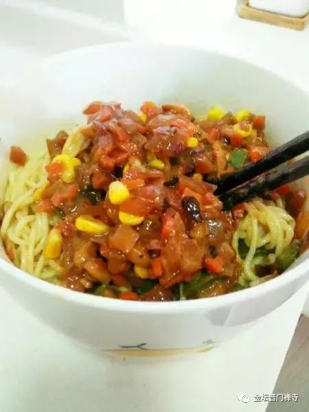 6、最后,一碗色香味俱全的素菜臊子面就做成了,做此面条的窍诀是要念:南无香积如来!求佛菩萨加持,素食做得美味,众生吃得欢喜! 把面条挑进碗里,把臊子舀在面上,然后加各种调料,就OK了!