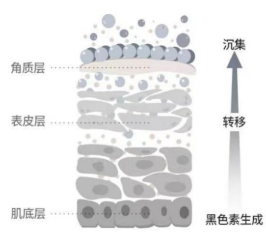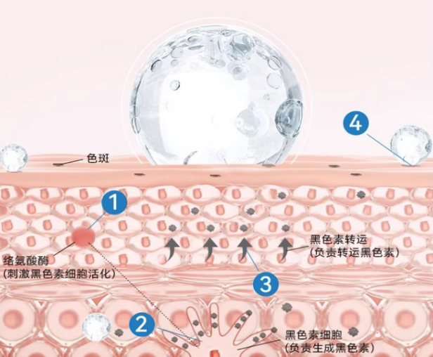 ①抑制黑色素转运,减少表皮黑色素含量(烟酰胺)②还原黑色素中间体,减少黑色素合成(光果甘草)③胞外阻截黑色素信号(α-熊果苷)④抗脂质氧化淡化色斑(MELOID黄细心根提取物)