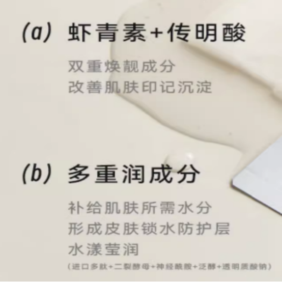 →抑制淡化黑色素:传明酸是一种蛋白酶抑制剂,能够抑制乱色酶和黑色素细胞的活性。 →能够淡化黑色素形成斑点、色素沉着等,起到提亮肤色的效果。 →促进胶原蛋白再生:再生的同时可以帮助皮肤延缓出现的皱纹、皮肤松弛等情况。 →促进皮肤吸收:可以增加皮肤的新陈代谢、活性,是皮肤更加透亮、有弹性等。提亮+抗初老+水润,多种成分搭配组合,多管齐下提亮去黄抗初老