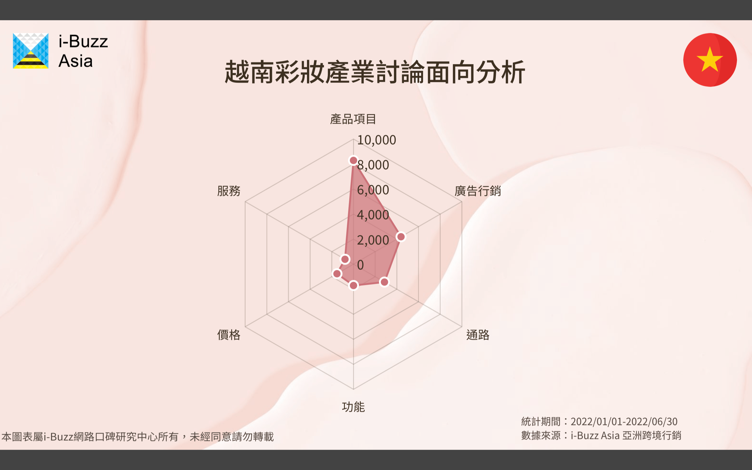 什么是越南人最喜欢用的化妆品呢?i-Buzz Asia跨境产业研究报告发现,越南消费者对彩妆品项的讨论,声量前三大为「口红」、「睫毛膏」及「粉底」,其他还有粉底、粉饼、定妆粉、眼线、眼影、亮粉、妆前乳等彩妆品。