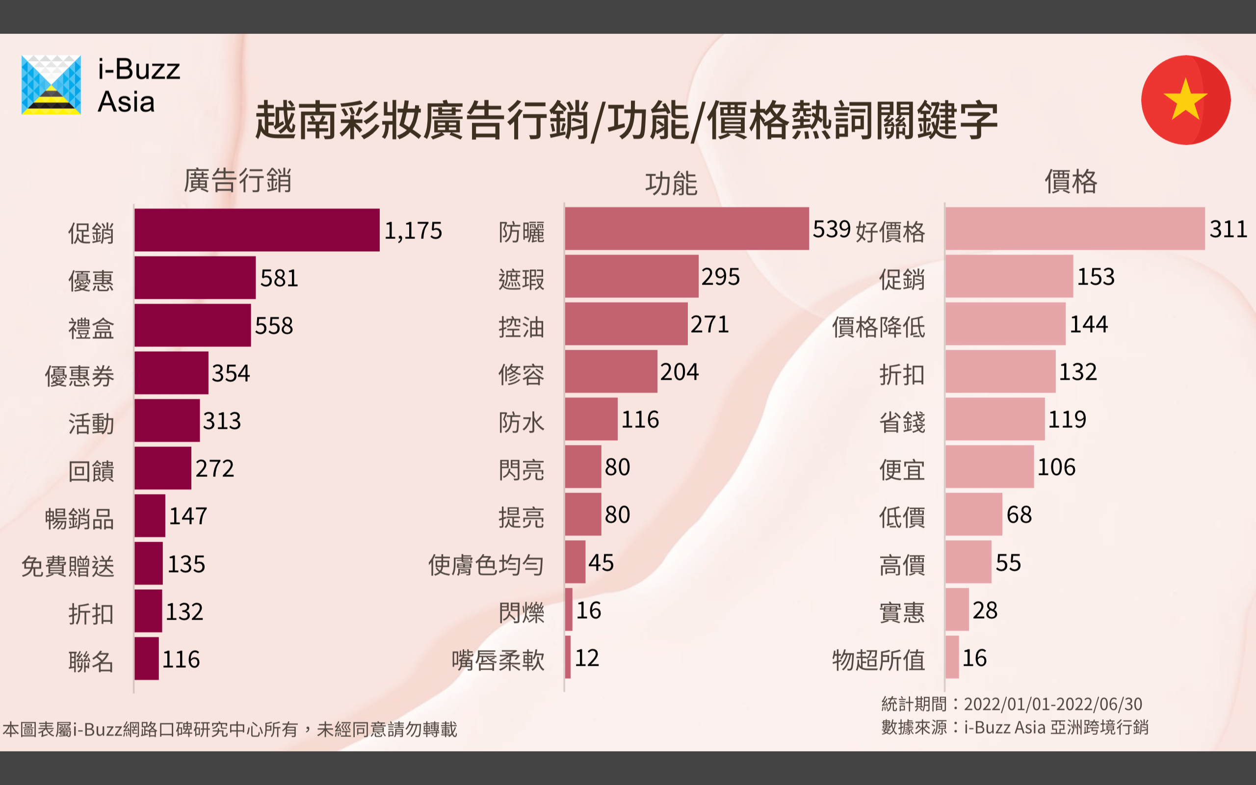 最后i-Buzz Asia针对彩妆「广告营销」、「功能」及「价格」的热词进行分析。在越南人的审美观念中,拥有白皙皮肤的女生是漂亮的,然而越南天气炎热、日晒多,因此越南女生对于防晒十分重视,也延伸至化妆品的选择,「防晒」为重要的功能面关键字。「广告营销」热词中,越南人容易被「促销、优惠、礼盒、活动及反馈」等促销优惠活动吸引,许多彩妆品牌也经常推出折价、限时抢购、满额赠送、反馈等营销手段吸引消费者购买。