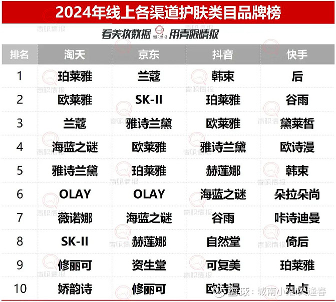 国产最大品牌珀莱雅位居淘天第1、抖音第2、京东第5、快手第9,韩束的主要渠道在抖音和快手,分别位居第1和第5。