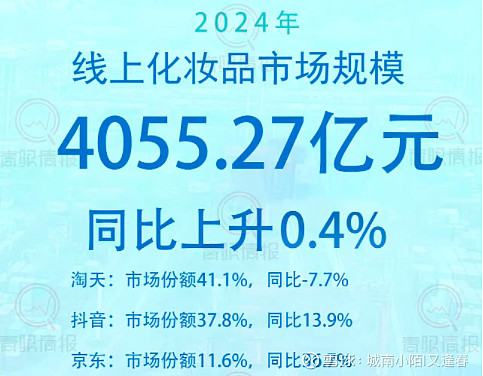 2024年中国线上化妆品市场规模为4055.27亿元,同比上升0.4%。淘天、抖音和京东三大渠道合计市场份额高达90.5%,其中,淘天的市场份额最高41.1%,不过同比下降了7.7%;抖音的市场份额次之37.8%,同比上升13.9%,已逼近淘天的市场份额,差距越来越小了;京东的市场份额11.6%,同比上升36.7%,与淘天和抖音差距还是很大的。