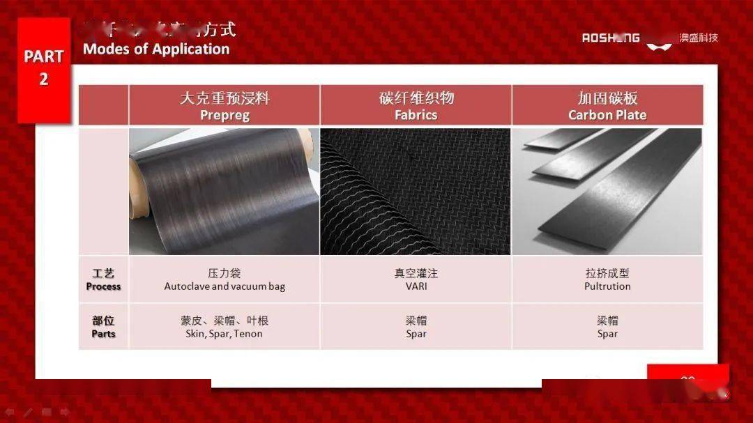 据研究资料表明,只在大梁处用碳纤维复合材料替换玻璃纤维复合材料,叶片重量减轻12%,并且具有更高的刚性和耐疲劳性,同时带来更低的运输安装成本以及维修成本,还有延长风机使用寿命的成本降低。碳纤维复合材料的成型方法多种多样,对于复合材料板材的生产制造也有多种选择,如预浸料工艺、碳布灌注工艺和拉挤工艺等。