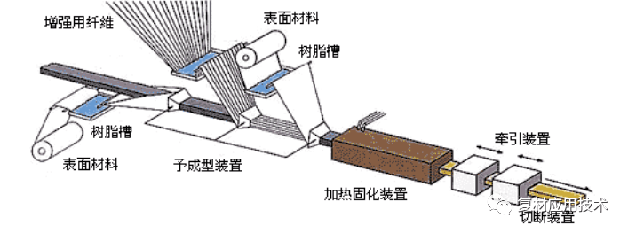 拉挤成型的一般步骤有纤维供给─纤维导向─树脂浸渍─预成型─拉挤成型─牵引─切割─拉挤成型制品,其加热成型部分一般分为预热区、凝胶区和固化区,如上图所示。现有的拉挤树脂包括不饱和聚酯树脂、乙烯基树脂、环氧树脂等。