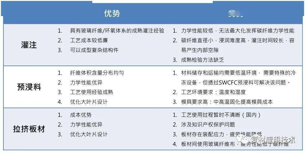 碳纤维制作叶片大梁的不同工艺受到了多家公司的研究,而随着风电的快速发展,大叶片的趋势也越来越明显,碳纤维在叶片中应用也成了必然。但三种工艺差异明显,如何选择就是一个问题。下表是某家公司对三种工艺的分析对比。