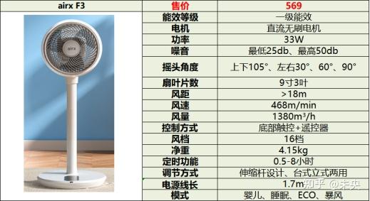 F4的风扇摇头角度更大,左右可以120°摇头,而F3的是左右90°摇头。F4低风档运行相对更平稳一点,噪音值在20分贝左右,F3的是25分贝。F4多了个自然送风模式,可以模仿大自然般随机送风,时柔风,时大风。F3的风挡选择会多4个档位,档位可调节选择更多。不足: