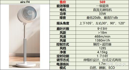 风挡选择比F3的要少。小结:F4外观上采用金属喷漆杆、加了橙色提手,整体的质感做了一定的提升,基础风力配置方面和F3是一样的,区别主要是摇头覆盖的角度更广,以及低档运行的噪音要优于F3,两款产品的售价差不多,如果平时习惯开中低档风的选择这款会更合适。