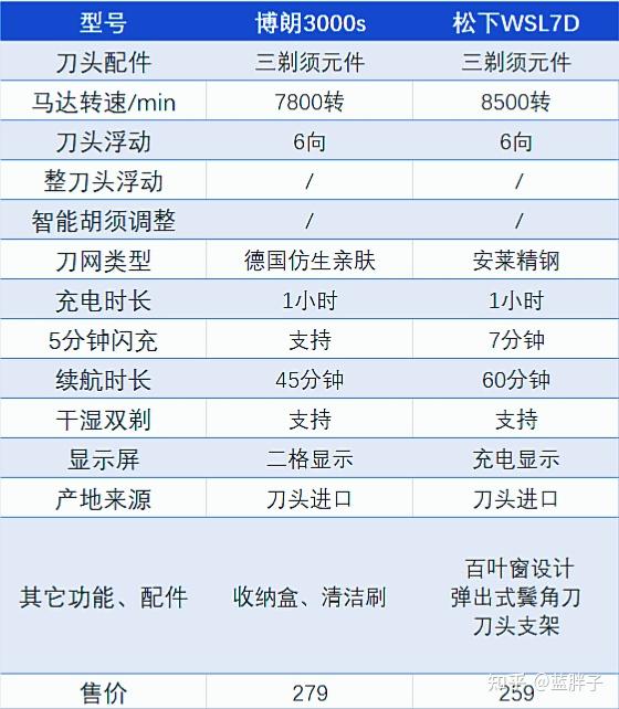 博朗的刀网较为细腻、温润,比较适合皮肤较差的用户松下的拱形刀网和刀片的设计,会比博朗3系更加的贴合下巴等部位,同时还有一个“百叶窗”设计,这个作用是剃须后直接掰开对着水流冲洗,起到免拆快清洁的效果博朗3系采用的是镍氢电池,松下WSL7D用的是锂电池,个人体验了1年多没有体验到差别,大家可以根据颜值喜好,价位差异来选择即可。