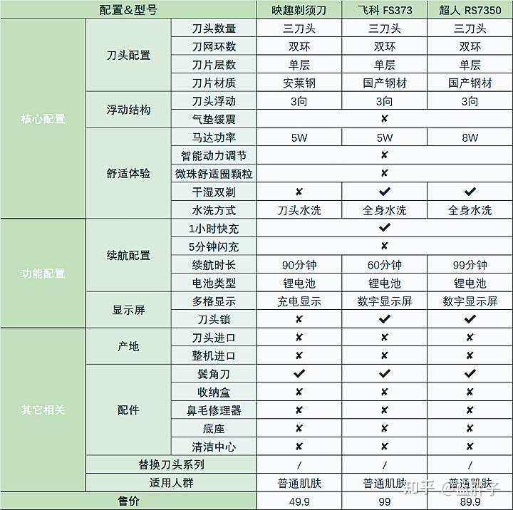 往复式和旋转式工作噪音比对https://www.zhihu.com/video/1418543320696586240二、不同系列电动剃须刀的配置特性往复式类型旋转式类型1、往复式类型低中高端不同系列型号配置差异如下: