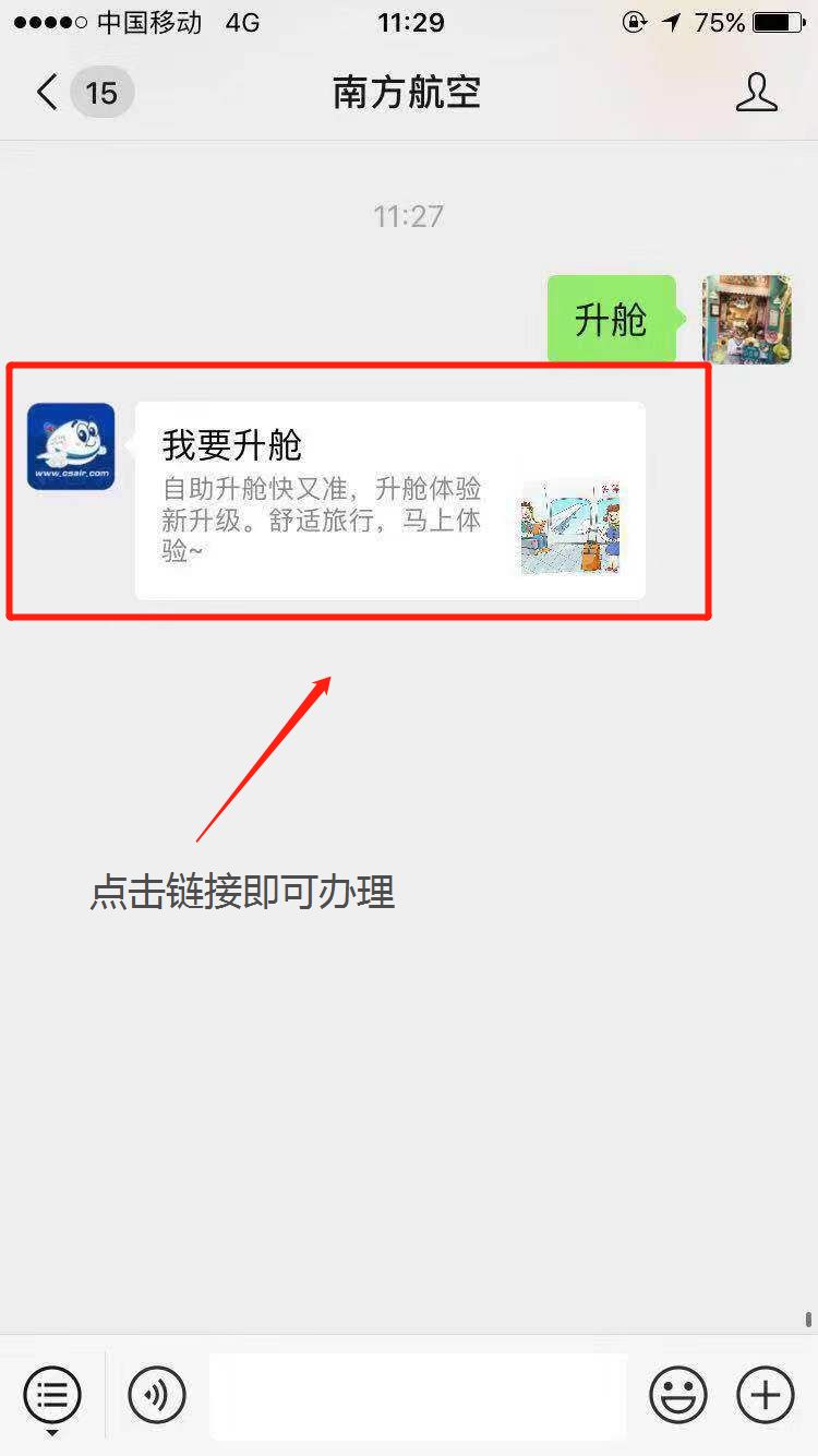 在【 南方航空】对话框输入“升舱”即可办理升舱