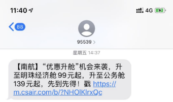 登机口升舱是通过接收南航短信或微信邀约的形式办理,登机前要注意查看短信和微信消息哦~