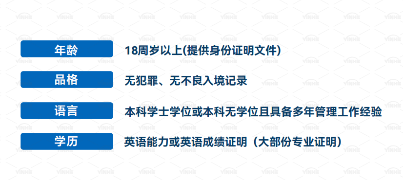 申请条件:年满18周岁、本科学历起、英语水平良好、有一定的经济能力(花销较大)。