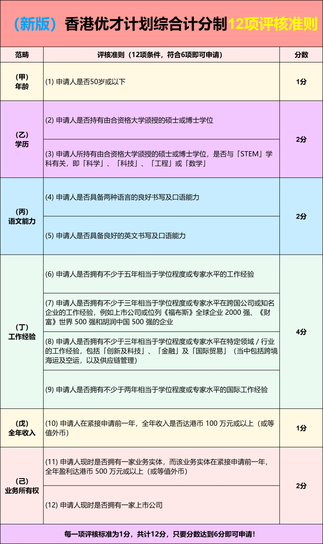 最新适用的申请资格门槛是符合12个评核准则的其中6个才能递交申请。