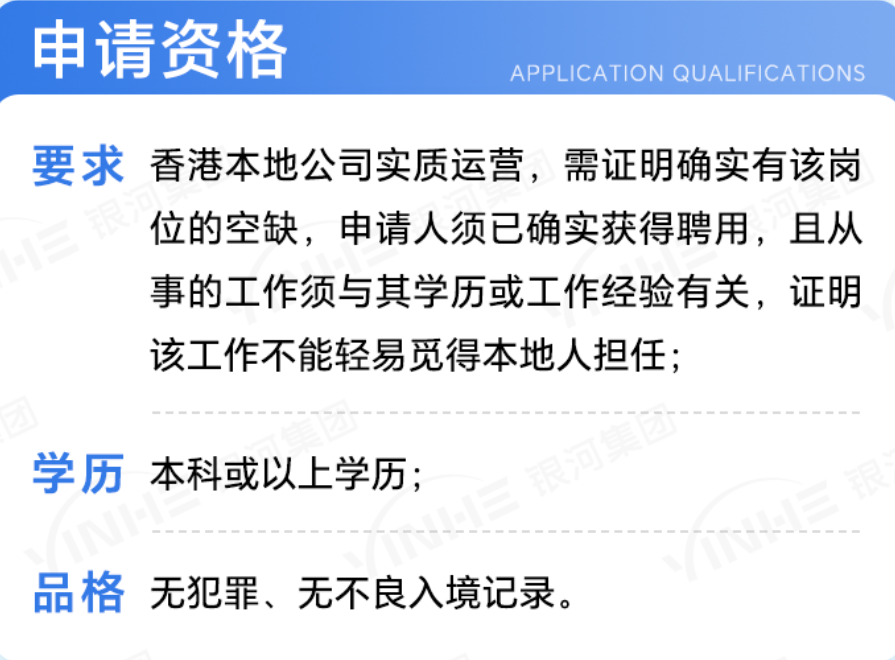 申请条件:年满18周岁以上,大专学历及以上、已经获得香港公司的聘任、聘任offer的薪资起码要跟市场持平。