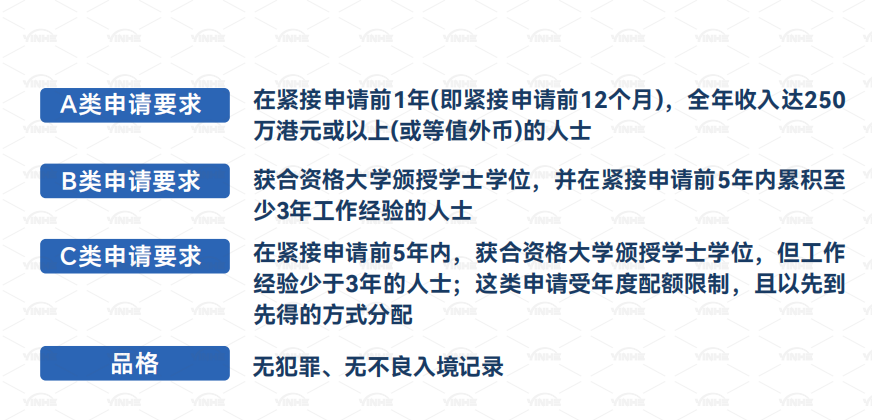申请条件:申请前1年年薪达250万港币,或本科毕业于全球合资格大学。