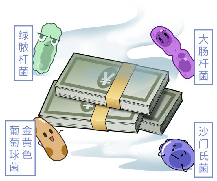 香港城市大学一项研究中国内地货币的检测结果显示,每张纸币平均含菌量17.8万个,5角、1元、1角面额的纸币,每张附带的菌数更高达1800万个。