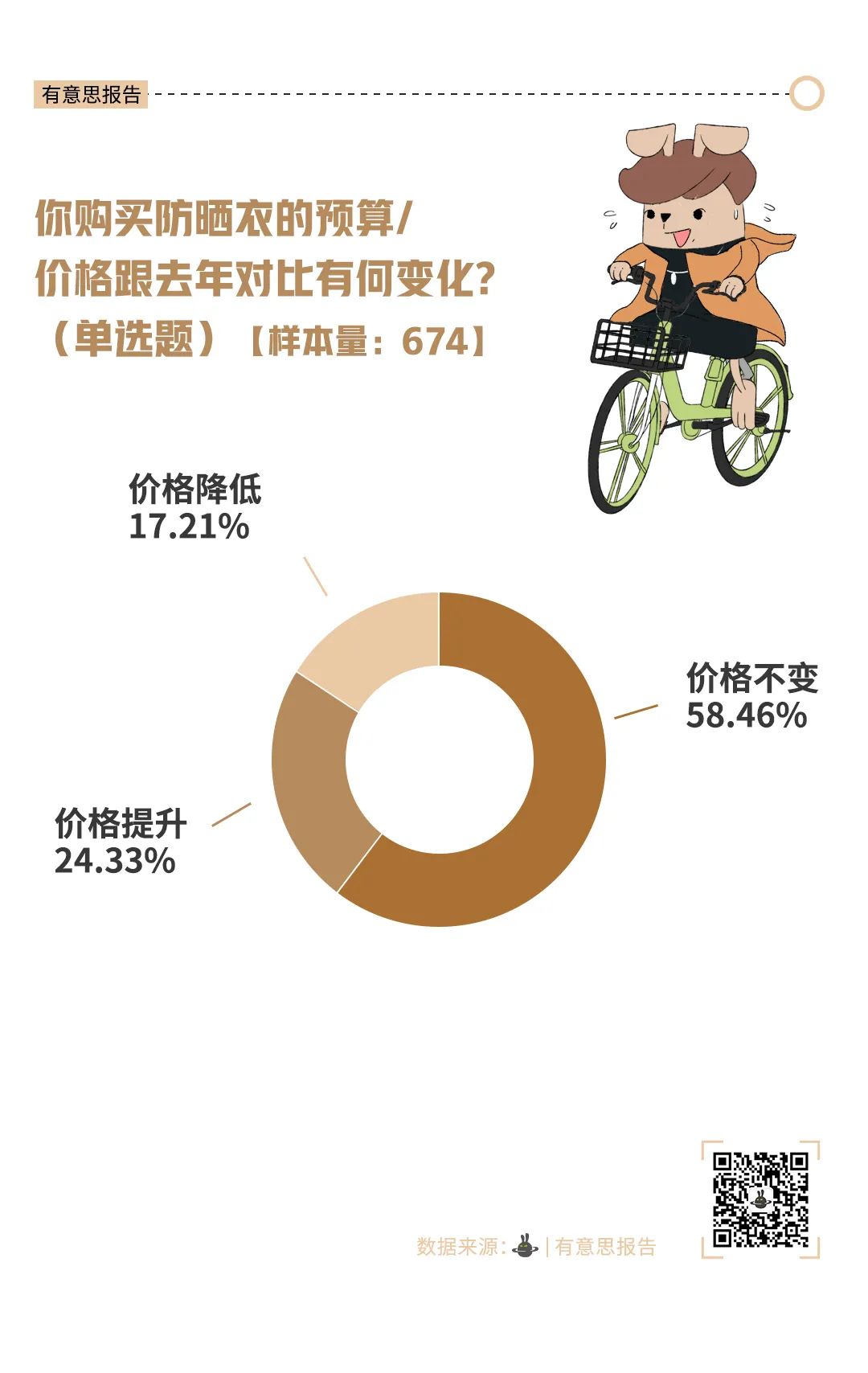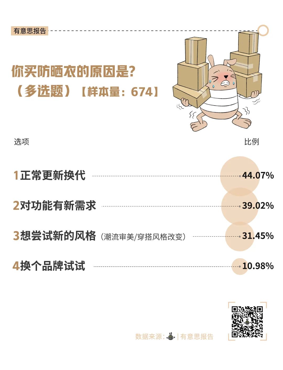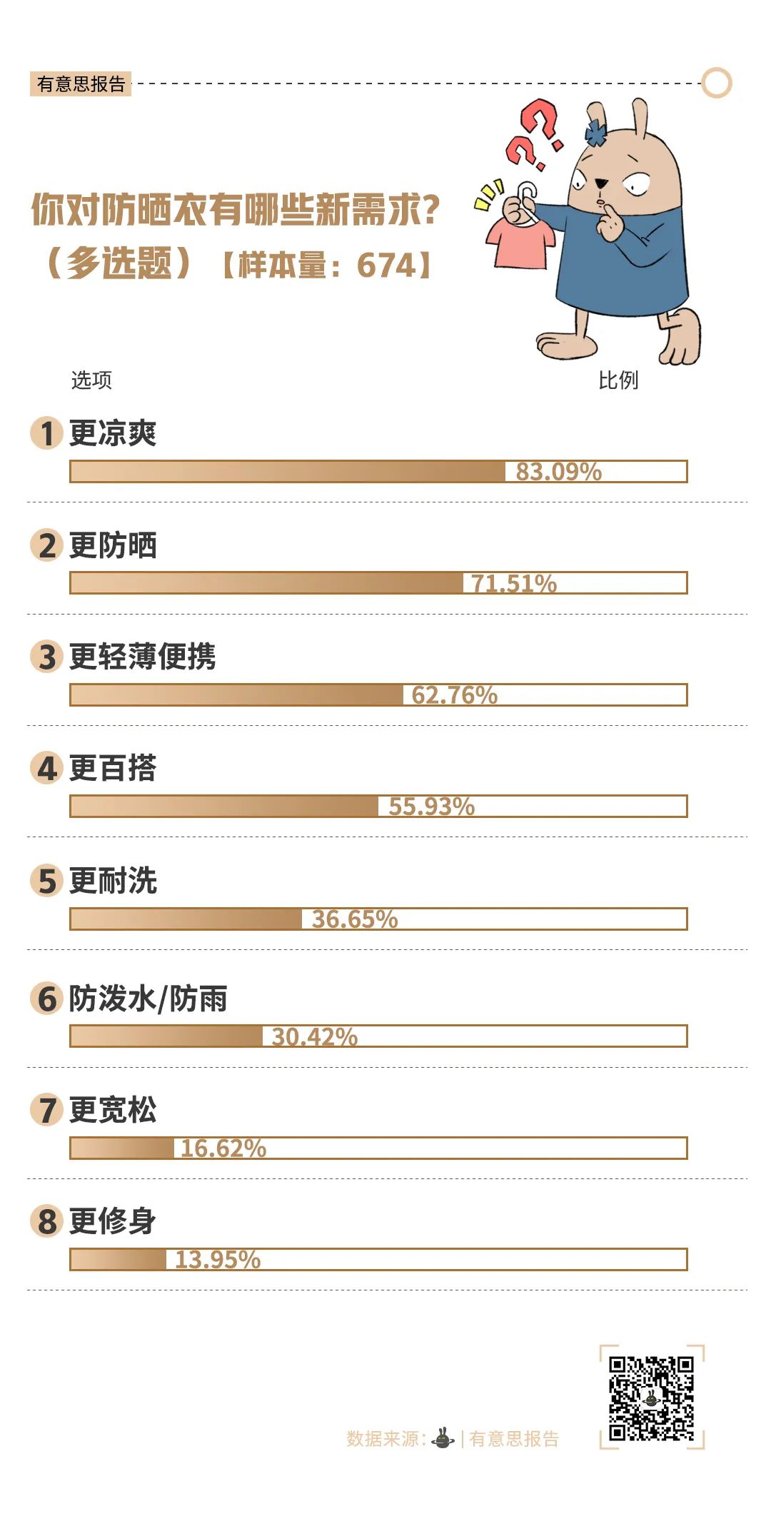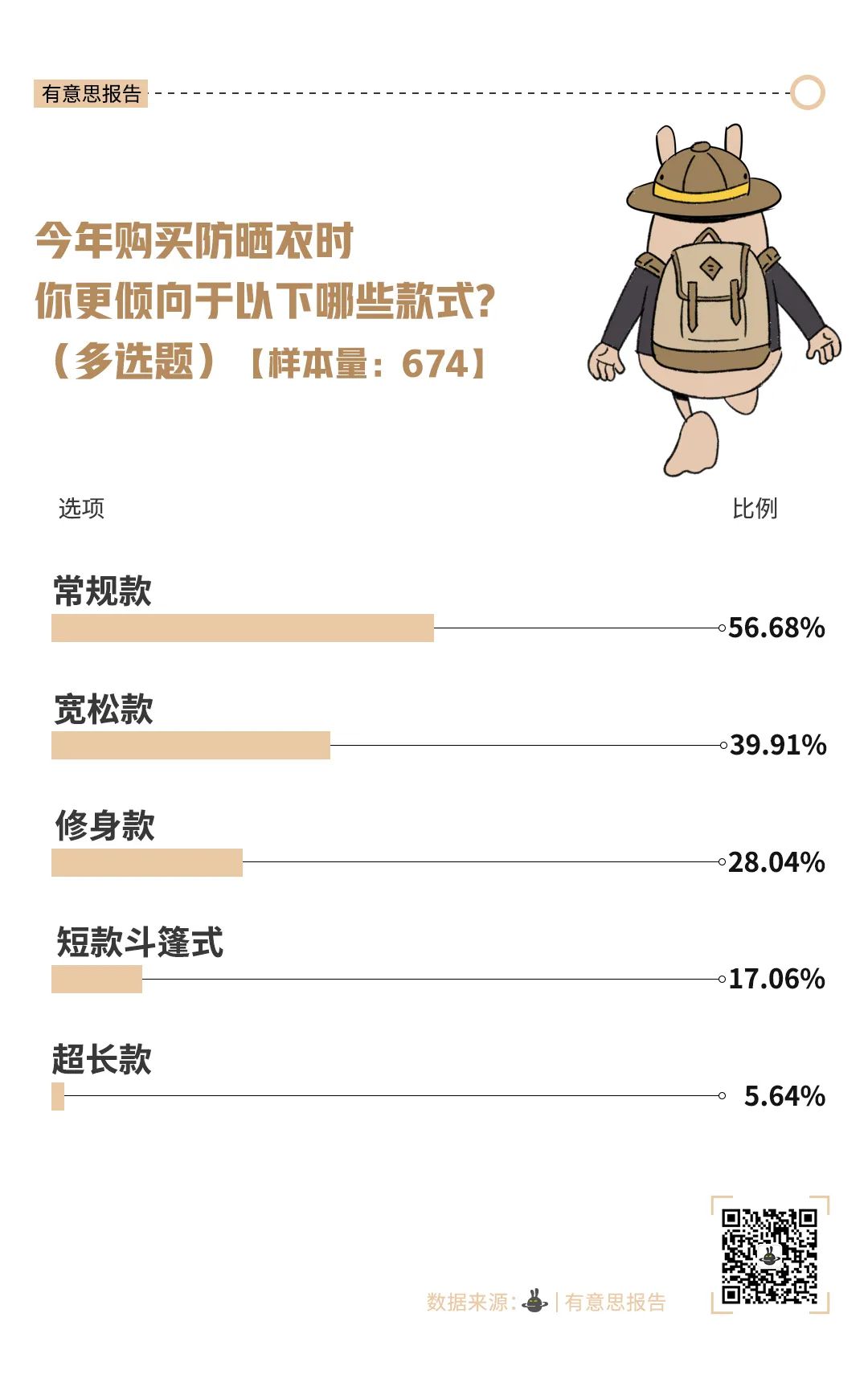 防晒衣的流行趋势为什么也变成了“越户外越时髦”?今年大家对防晒衣有哪些新需求?有意思报告发起了“2024防晒衣调查”,共收集到674份有效问卷。