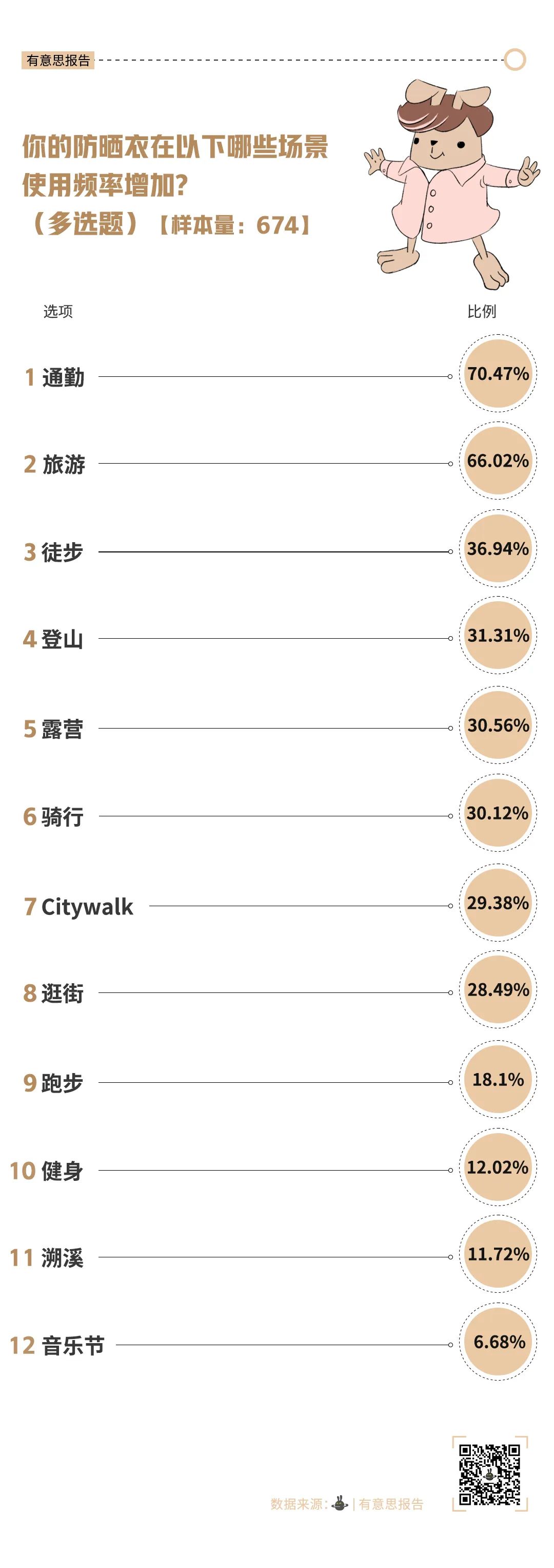 在“你的防晒衣在以下哪些场景使用频率增加”一题中,通勤仍然位列第一,旅游紧随其后,防晒衣成为旅游时的新刚需。
